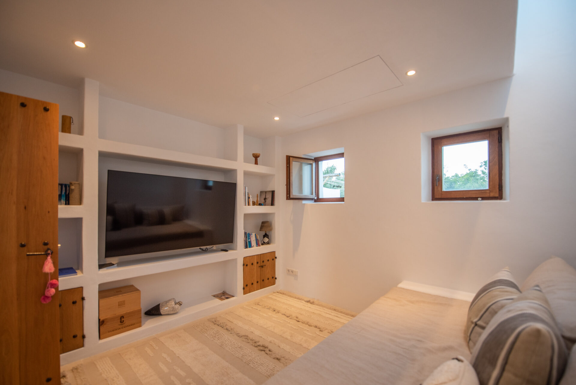 As you step into the living room, you are welcomed into an airy, stylish space flooded with light. The thick white walls and stunning wooden roofs are unmistakable features of traditional Ibiza architecture, whilst the high ceiling windows are a modern feature that adds light and brings the bright blue sky inside.